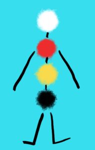 The yellow center is connected to and receives information from, the field. Then the information pass to the white center and it gets processed and sorted; as a result, information gets synchronized between the field and the organism. Synchronized information moves to the black center, and it is coded in the form of DNA. The black center feels like a “3D printer” – it “prints” received information into matter. The red center is the regulator of this system, it’s like heart. It connects only internally to the other centers and regulates the flow between them. If the red center stops its function, it causes splitting of the system and disintegration of its unity.